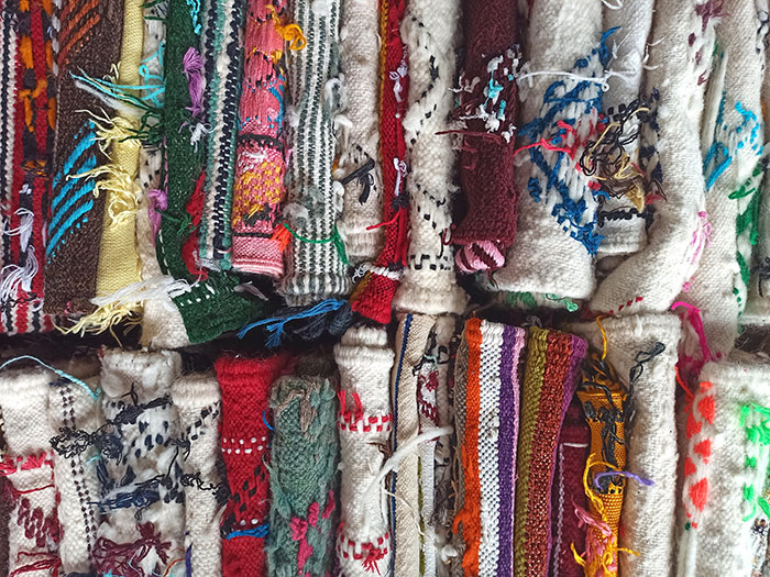 The weaving is strictly feminine, in spring, the shearing of the sheep and the purchase of the wool fleeces are the responsibility of men. The weaving cycle starts with the washing of the raw wool, the drying in the sun, then the cleaning and the sorting of the washed wool; put on the ground the wool dries in the sun and whitens.